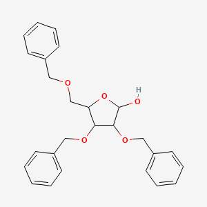 3,4-Bis(phenylmethoxy)-5-(phenylmethoxymethyl)oxolan-2-ol (IUPAC name: (3R,4R,5R)-3,4-bis(phenylmethoxy)-5-(phenylmethoxymethyl)oxolan-2-ol) is a benzyl-protected carbohydrate derivative with the molecular formula C₂₆H₂₈O₅ and a molecular weight of 420.5 g/mol . Its structure features three benzyl ether groups and a secondary alcohol group at the C2 position of the oxolane (tetrahydrofuran) ring. This compound is a key intermediate in synthesizing nucleoside analogs and antiviral agents, such as remdesivir impurities .
