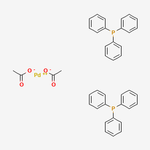 The mechanism by which bis(triphenylphosphinepalladium) acetate exerts its catalytic effects involves the coordination of the palladium center with the reactants. This coordination facilitates the activation of the reactants, allowing for the formation of new bonds. The palladium center undergoes cycles of oxidation and reduction, enabling the catalytic process to proceed efficiently .