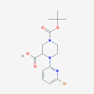 The mechanism of action of 1-(6-Bromopyridin-2-yl)-4-(tert-butoxycarbonyl)piperazine-2-carboxylic acid involves its interaction with specific molecular targets. The bromopyridine moiety can interact with enzymes or receptors, modulating their activity. The piperazine ring provides structural flexibility, allowing the compound to fit into various binding sites. The tert-butoxycarbonyl group can enhance the compound’s stability and bioavailability, while the carboxylic acid group can participate in hydrogen bonding and ionic interactions.
