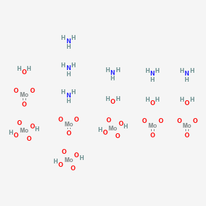 Ammonium paramolybdate tetrahydrate is an ionic compound with the chemical formula (NH₄)₆Mo₇O₂₄·4H₂O.[1][2][3][4] Its molecular weight is approximately 1235.86 g/mol .[1][4] The core of the structure is the complex polyoxometalate anion known as the paramolybdate or heptamolybdate ion, [Mo₇O₂₄]⁶⁻.[5][6] This anion is a condensed cluster of seven molybdenum atoms, each in a +6 oxidation state and octahedrally coordinated to oxygen atoms.[5] These octahedra are linked through shared corners and edges. The structure features terminal, doubly-bridging, and triply-bridging oxide ligands.[5] The negative charge of the heptamolybdate anion is balanced by six ammonium cations (NH₄⁺). The formula unit is completed by four molecules of water of crystallization, which are integral to the crystal lattice.