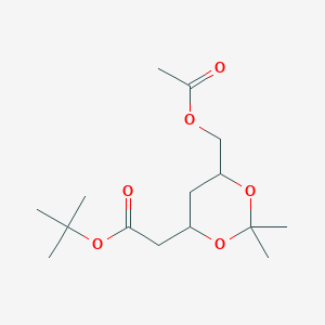 This compound is a chiral intermediate critical in synthesizing pharmaceuticals such as rosuvastatin ethyl ester and heptenoic acid cyclopentyl ester derivatives . Its structure features a 1,3-dioxane ring with stereochemical specificity (4R,6R-cis configuration), a tert-butyl ester group at position 4, and an acetyloxy methyl substituent at position 6. The tert-butyl ester enhances stability and solubility, while the acetyloxy group enables controlled reactivity through hydrolysis or substitution . Industrial synthesis routes prioritize cost-efficiency and safety, employing Blaise reactions and avoiding hazardous reagents like lithium diisopropylamide (LDA) .