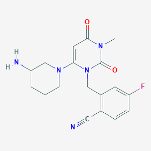 The mechanism of action of 2-[6-(3-Amino-piperidin-1-yl)-3-methyl-2,4-dioxo-3,4-dihydro-2H-pyrimidin-1-ylmethyl]-4-fluoro-benzonitrile involves its interaction with specific molecular targets and pathways. The compound may act as an inhibitor or activator of certain enzymes, receptors, or signaling pathways. For example, it may inhibit dipeptidyl peptidase-4 (DPP-4) activity, leading to increased levels of glucagon-like peptide-1 (GLP-1) and improved glucose tolerance . The exact molecular targets and pathways depend on the specific biological context and the compound’s structure-activity relationship.