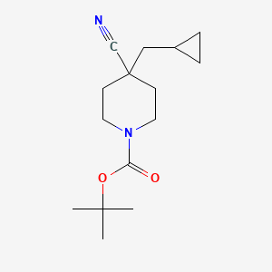 The mechanism of action of tert-butyl 4-cyano-4-(cyclopropylmethyl)piperidine-1-carboxylate involves its interaction with specific molecular targets. The cyano group can participate in hydrogen bonding and electrostatic interactions with biological molecules, while the piperidine ring provides a scaffold for binding to receptors or enzymes. The compound’s effects are mediated through its ability to modulate the activity of these targets, influencing various biochemical pathways .