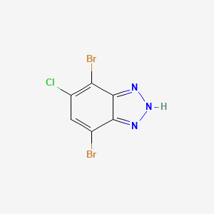 The compound features a benzotriazole core substituted with two bromine atoms at positions 4 and 7, and a chlorine atom at position 4. The triazole ring contributes to metabolic stability and hydrogen-bonding interactions, while halogen substituents enhance lipophilicity and influence electronic properties .