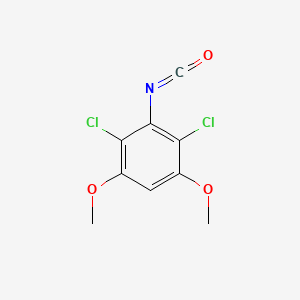 This compound is a substituted benzene derivative featuring two chlorine atoms at positions 2 and 4, two methoxy groups at positions 1 and 5, and a reactive isocyanato (-NCO) group at position 2. The isocyanato group confers significant reactivity, making the compound valuable in synthesizing polymers, agrochemicals, or pharmaceuticals. Its structural uniqueness arises from the combination of electron-withdrawing (Cl) and electron-donating (methoxy) substituents, which modulate its electronic properties and reactivity .