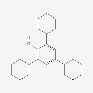 The molecular structure of 2,4,6-tricyclohexylphenol consists of a phenolic group substituted with three cyclohexyl groups at the 2, 4, and 6 positions. This arrangement enhances its hydrophobic characteristics and influences its reactivity in various chemical processes.