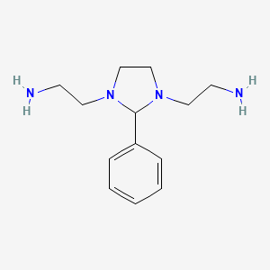 1,3-Imidazolidinediethanamine, 2-phenyl- is a bicyclic organic compound featuring a five-membered imidazolidine ring substituted with a phenyl group at the 2-position and ethanamine groups at the 1- and 3-positions. This structure confers unique electronic and steric properties, making it a candidate for applications in catalysis and coordination chemistry. The phenyl group acts as a conformational anchor, influencing electronic effects and reactivity .
