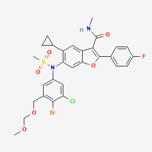 The synthesis of 6-(N-(4-bromo-3-chloro-5-((methoxymethoxy)methyl)phenyl)methanesulfonamido)-5-cyclopropyl-2-(4-fluorophenyl)-N-methylbenzofuran-3-carboxamide involves multiple steps, each requiring specific reagents and conditions: