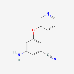 The synthesis of 3-amino-5-pyridin-3-yloxybenzonitrile typically involves the reaction of 3-hydroxy-pyridine with 5-cyano-aniline under specific conditions. One common method is the nucleophilic aromatic substitution reaction, where the hydroxyl group of 3-hydroxy-pyridine is replaced by the aniline group. This reaction often requires a base such as potassium carbonate and a solvent like dimethylformamide (DMF) to proceed efficiently .