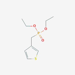 - Methodological Answer : The synthesis typically involves nucleophilic substitution or cross-coupling reactions. For example, substituting a bromine atom in 3-(bromomethyl)thiophene with diethyl phosphonite under basic conditions (e.g., K₂CO₃ in DMF) can yield the target compound . Optimization includes controlling reaction temperature (60–80°C) and using anhydrous solvents to prevent hydrolysis. Monitoring via TLC or GC-MS ensures intermediate purity. For phosphinylmethyl derivatives, inert atmospheres (N₂/Ar) are critical to avoid oxidation of the phosphonate group.