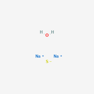 Sodium sulfide hydrate (Na₂S·9H₂O, CAS 27610-45-3) is a colorless, water-soluble alkaline compound with the molecular formula H₂Na₂OS and a molecular weight of 96.06 g/mol . It is widely used in industrial applications such as ore flotation , thermochemical energy storage , and nanoparticle synthesis . When exposed to moist air, it releases hydrogen sulfide (H₂S), a toxic gas, necessitating careful handling (safety code R31, S26) . Commercial grades often contain polysulfides, giving them a yellow-to-red appearance despite the pure form being colorless .