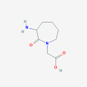 The synthesis of 2-(3-amino-2-oxoazepan-1-yl)acetic acid typically involves the cyclization of appropriate precursors to form the azepane ring, followed by the introduction of the amino and carboxylic acid groups. One common method involves the reaction of a suitable amine with a cyclic anhydride or lactone under controlled conditions to form the azepane ring. The reaction conditions often include the use of solvents such as dichloromethane or ethanol and catalysts like triethylamine or pyridine to facilitate the cyclization process.