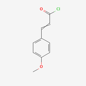 The preparation of 4-methoxycinnamic acid chloride begins with the synthesis of its precursor, 4-methoxycinnamic acid. A widely adopted method involves the condensation of malonic acid with p-anisaldehyde (4-methoxybenzaldehyde) under reflux conditions. In this reaction, malonic acid (1.24 g, 12 mmol) and p-anisaldehyde (1.36 g, 10 mmol) are combined in pyridine (6 mL) with piperidine (0.6 mL) as a catalyst. The mixture is heated at reflux for 4 hours, after which it is cooled and acidified with hydrochloric acid (10 M, 80 mL) to precipitate the product. This method yields 4-methoxycinnamic acid as a white powder with a 98% yield.