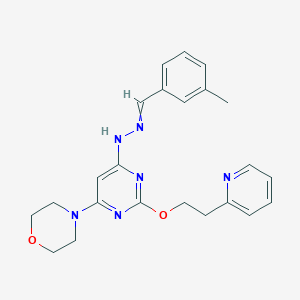 The exact mechanism of action for N-[(3-methylphenyl)methylideneamino]-6-morpholin-4-yl-2-(2-pyridin-2-ylethoxy)pyrimidin-4-amine is not well-documented. hydrazine derivatives typically exert their effects by interacting with biological molecules, such as enzymes or receptors, through covalent or non-covalent interactions. These interactions can lead to the inhibition or activation of specific molecular pathways, affecting cellular functions.