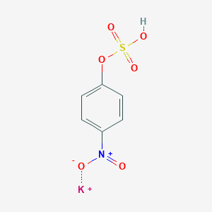 Potassium 4-nitrophenyl sulfate is synthesized via sulfation reactions, often using 4-nitrophenol and sulfur trioxide derivatives. Characterization includes nuclear magnetic resonance (NMR) for structural confirmation and mass spectrometry (MS) for purity assessment. Crystallographic studies (e.g., X-ray diffraction) confirm its monoclinic crystal system, with bond lengths critical for understanding sulfate ester reactivity .