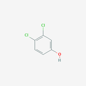 This compound (3,4-DCP) is a halogenated aromatic organic compound with the molecular formula C₆H₄Cl₂O.[1][2] It is a chlorinated derivative of phenol (B47542) and one of six isomers of dichlorophenol.[2][3] At room temperature, it exists as a white to off-white or light brown crystalline solid with a characteristic strong, phenolic odor.[1][4] This compound serves as a critical chemical intermediate, primarily in the synthesis of agrochemicals, pharmaceuticals, and dyes.[5][6] Its molecular structure, featuring a hydroxyl group and two chlorine atoms on the benzene (B151609) ring, provides reactive sites that are essential for building more complex molecules.[6]