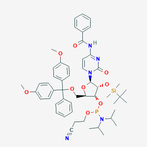 InChI=1S/C52H66N5O9PSi/c1-36(2)57(37(3)4)67(63-34-18-32-53)65-46-44(35-62-52(39-21-16-13-17-22-39,40-23-27-42(60-8)28-24-40)41-25-29-43(61-9)30-26-41)64-49(47(46)66-68(10,11)51(5,6)7)56-33-31-45(55-50(56)59)54-48(58)38-19-14-12-15-20-38/h12-17,19-31,33,36-37,44,46-47,49H,18,34-35H2,1-11H3,(H,54,55,58,59)/t44-,46-,47-,49-,67?/m1/s1 | |