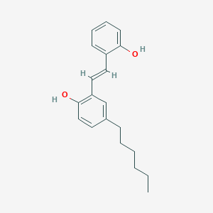 trans-5-Hexyl-2,2'-stilbenediol is a synthetic stilbene derivative characterized by a central ethylene bridge linking two phenolic rings, with a hexyl substituent at the 5-position of one aromatic ring. Its structure confers unique physicochemical properties, including enhanced lipophilicity due to the hexyl chain, which may improve membrane permeability and bioavailability compared to simpler stilbene analogs. Stilbene derivatives are widely studied for their biological activities, particularly in oncology and endocrinology, owing to their structural resemblance to endogenous estrogens and capacity to modulate hormone receptors .