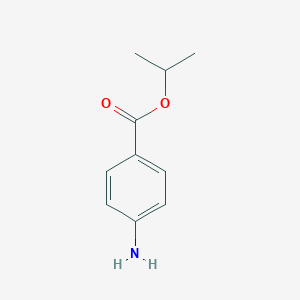 Isopropyl 4-aminobenzoate (B8803810), also known as Isopropyl p-aminobenzoate, is an organic compound with the chemical formula C₁₀H₁₃NO₂. It belongs to the class of aminobenzoate esters, a group of compounds known for their applications in the pharmaceutical and cosmetic industries. Structurally similar to local anesthetics such as benzocaine (B179285) (ethyl 4-aminobenzoate) and risocaine (B1679344) (propyl 4-aminobenzoate), Isopropyl 4-aminobenzoate serves as a valuable molecule in drug discovery and development.[1] Its properties make it a subject of interest for studies on percutaneous absorption, enzymatic inhibition, and as a potential topical anesthetic.[1] This technical guide provides a comprehensive overview of the chemical and physical properties of this compound, detailed experimental protocols, and visualizations to aid in its application in research and development.