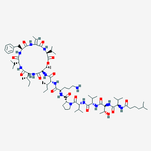 this compound is a cyclic depsipeptide with a unique macrocyclic structure. Its identification typically involves nuclear magnetic resonance (NMR) spectroscopy for structural elucidation and liquid chromatography–mass spectrometry (LC-MS) for purity assessment. Researchers must cross-reference spectral data with established literature to confirm identity, particularly focusing on key resonances for amino acid residues like valine and proline derivatives .