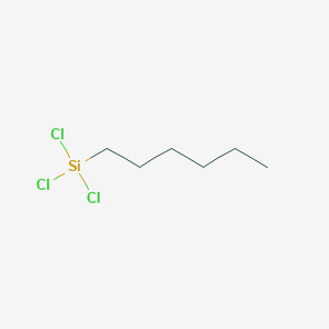 This compound, with the chemical formula C₆H₁₃Cl₃Si, is an organosilicon compound that presents as a colorless to pale yellow liquid. cymitquimica.com It is characterized by a six-carbon alkyl chain (hexyl group) attached to a trichlorosilyl (B107488) group. In chemical research, HTS is primarily investigated for its utility in materials science, where it functions as a surface modification agent and a coupling agent. cymitquimica.com Its reactivity, particularly with water and hydroxylated surfaces, allows it to form stable siloxane bonds, making it a key component in the functionalization of various substrates. noaa.gov It is also utilized as a surfactant and capping agent in the synthesis and stabilization of nanoparticles.