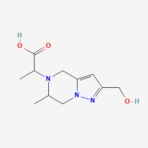 2-(2-(hydroxymethyl)-6-methyl-6,7-dihydropyrazolo[1,5-a]pyrazin-5(4H)-yl)propanoic acid is a useful research compound. Its molecular formula is C11H17N3O3 and its molecular weight is 239.27 g/mol. The purity is usually 95%.