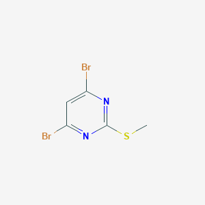 This compound is a highly functionalized heterocyclic compound with significant potential as a scaffold in organic synthesis. Its reactivity is primarily dictated by the two bromine atoms at the C4 and C6 positions and the methylthio group at the C2 position. The electron-withdrawing nature of the pyrimidine (B1678525) ring, further activated by the bromo substituents, renders the C4 and C6 positions highly susceptible to nucleophilic aromatic substitution (SNAr) reactions. This allows for the selective or sequential displacement of the bromide ions by a wide variety of nucleophiles.