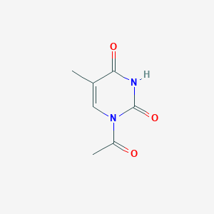 Acetylthymine is a chemically modified derivative of thymine, a canonical nucleobase in DNA. The acetylation of thymine introduces an acetyl group (-COCH₃) at a specific position, altering its physicochemical properties and functional applications. This modification is frequently employed in oligonucleotide synthesis to study DNA interactions, site-specific cleavage, and molecular recognition .