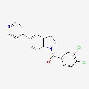 The mechanism of action of (3,4-Dichlorophenyl)(5-(pyridin-4-yl)indolin-1-yl)methanone involves its interaction with specific molecular targets. The compound can bind to enzymes or receptors, modulating their activity. The pathways involved may include signal transduction pathways, where the compound acts as an agonist or antagonist, influencing cellular responses.