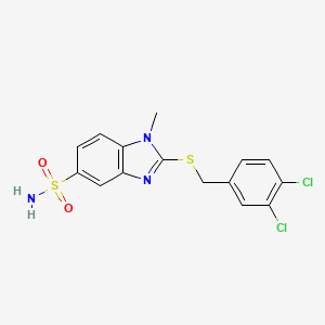 The IUPAC name for this compound is 2-[(3,4-dichlorobenzyl)sulfanyl]-1-methyl-1H-benzimidazole-5-sulfonamide . Its structural formula (Figure 1) comprises: