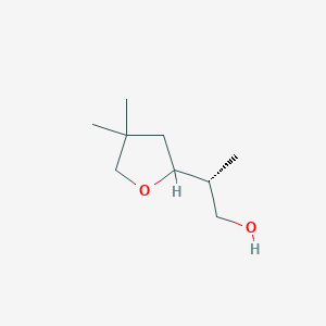 The mechanism of action of (2R)-2-(4,4-dimethyloxolan-2-yl)propan-1-ol involves its interaction with specific molecular targets, such as enzymes and receptors. The compound’s structure allows it to fit into the active sites of enzymes, modulating their activity. Additionally, its ability to form hydrogen bonds and hydrophobic interactions with receptors contributes to its biological effects. The exact pathways and molecular targets vary depending on the specific derivative and application.