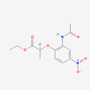 The mechanism of action of ethyl 2-[2-(acetylamino)-4-nitrophenoxy]propanoate involves its interaction with specific molecular targets. The nitro group can undergo reduction to form reactive intermediates that interact with biological molecules. The acetylamino group can form hydrogen bonds with proteins, affecting their function. The ester group can be hydrolyzed to release the active carboxylic acid, which can further interact with cellular targets.
