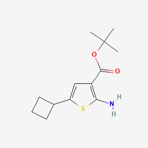 Tert-butyl 2-amino-5-cyclobutylthiophene-3-carboxylate is a synthetic organic compound that belongs to the class of thiophene derivatives. Thiophenes are heterocyclic compounds containing a sulfur atom in a five-membered ring. This particular compound is characterized by the presence of a tert-butyl group, an amino group, and a cyclobutyl group attached to the thiophene ring. The unique structure of this compound makes it an interesting subject for various chemical and biological studies.