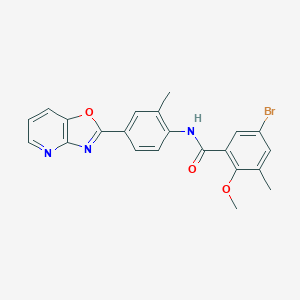 5-bromo-2-methoxy-3-methyl-N-[2-methyl-4-([1,3]oxazolo[4,5-b]pyridin-2-yl)phenyl]benzamide is a complex organic compound with potential applications in various scientific fields. This compound features a benzamide core substituted with bromine, methoxy, and methyl groups, along with an oxazolo[4,5-b]pyridine moiety. Its unique structure makes it a valuable candidate for research in medicinal chemistry and material science.
