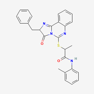 2-((2-Benzyl-3-oxo-2,3-dihydroimidazo[1,2-c]quinazolin-5-yl)thio)-N-(o-tolyl)propanamide is a synthetic heterocyclic compound featuring a fused imidazo[1,2-c]quinazolinone core modified with a benzyl group at position 2, a thioether-linked propanamide side chain at position 5, and an o-tolyl (2-methylphenyl) substituent on the amide nitrogen. This structure combines a rigid aromatic scaffold with flexible substituents, making it a candidate for targeting enzymes or receptors involved in oncology or inflammation. Its molecular weight is estimated to be ~490–500 g/mol, based on structural analogs like N-(3-methoxybenzyl)-2-((3-oxo-2-phenyl-2,3-dihydroimidazo[1,2-c]quinazolin-5-yl)thio)propanamide (484.6 g/mol) .