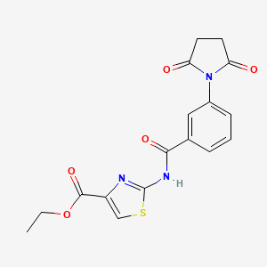 The mechanism by which Ethyl 2-(3-(2,5-dioxopyrrolidin-1-yl)benzamido)thiazole-4-carboxylate exerts its effects depends on its specific application. For example, in drug development, the compound may interact with molecular targets such as enzymes or receptors, leading to inhibition or activation of specific pathways. The exact mechanism would need to be elucidated through detailed biochemical studies.