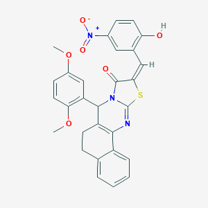 InChI=1S/C29H23N3O6S/c1-37-19-9-12-24(38-2)22(15-19)27-21-10-7-16-5-3-4-6-20(16)26(21)30-29-31(27)28(34)25(39-29)14-17-13-18(32(35)36)8-11-23(17)33/h3-6,8-9,11-15,27,33H,7,10H2,1-2H3/b25-14+ |