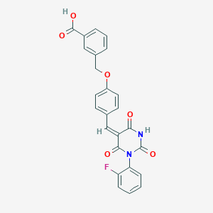 InChI=1S/C25H17FN2O6/c26-20-6-1-2-7-21(20)28-23(30)19(22(29)27-25(28)33)13-15-8-10-18(11-9-15)34-14-16-4-3-5-17(12-16)24(31)32/h1-13H,14H2,(H,31,32)(H,27,29,33)/b19-13+ |
