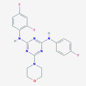 N-(2,4-difluorophenyl)-N’-(4-fluorophenyl)-6-morpholin-4-yl-1,3,5-triazine-2,4-diamine is a synthetic organic compound that belongs to the class of triazine derivatives. These compounds are known for their diverse applications in various fields such as agriculture, pharmaceuticals, and materials science. The unique structure of this compound, featuring multiple fluorine atoms and a morpholine ring, suggests potential for significant biological activity and industrial utility.
