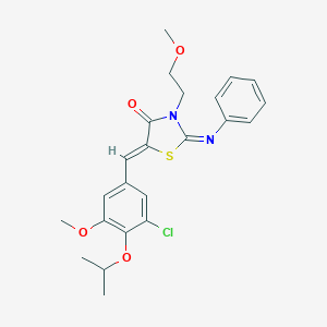 InChI=1S/C23H25ClN2O4S/c1-15(2)30-21-18(24)12-16(13-19(21)29-4)14-20-22(27)26(10-11-28-3)23(31-20)25-17-8-6-5-7-9-17/h5-9,12-15H,10-11H2,1-4H3/b20-14-,25-23? |