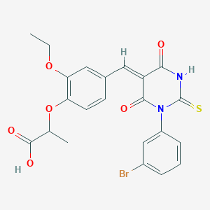 2-(4-{(Z)-[1-(3-bromophenyl)-4,6-dioxo-2-thioxotetrahydropyrimidin-5(2H)-ylidene]methyl}-2-ethoxyphenoxy)propanoic acid is a useful research compound. Its molecular formula is C22H19BrN2O6S and its molecular weight is 519.4 g/mol. The purity is usually 95%.