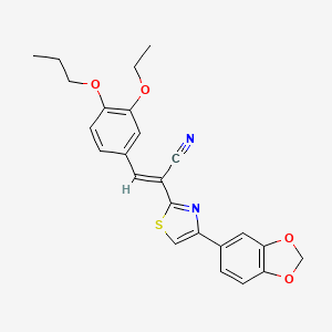 The compound (E)-2-(4-(benzo[d][1,3]dioxol-5-yl)thiazol-2-yl)-3-(3-ethoxy-4-propoxyphenyl)acrylonitrile is a complex organic molecule characterized by its unique structural features, which include a thiazole ring, a benzo[d][1,3]dioxole moiety, and an acrylonitrile functional group. This structural arrangement suggests potential for diverse biological activities, making it a candidate for further investigation in medicinal chemistry.