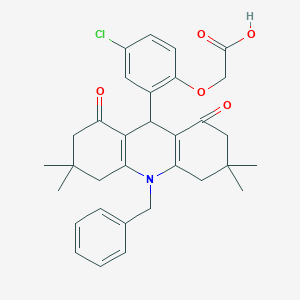 The synthesis of [2-(10-benzyl-3,3,6,6-tetramethyl-1,8-dioxo-1,2,3,4,5,6,7,8,9,10-decahydro-9-acridinyl)-4-chlorophenoxy]aceticacid typically involves multiple steps, including the formation of the acridine core, the introduction of the benzyl group, and the attachment of the chlorophenoxyacetic acid moiety. The reaction conditions often require the use of specific catalysts, solvents, and temperature controls to ensure the desired product is obtained with high purity and yield.