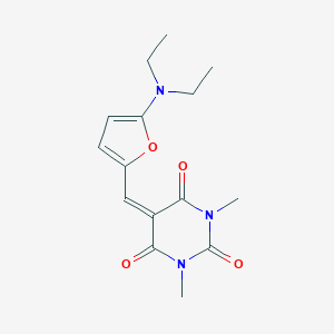 The synthesis of 5-{[5-(diethylamino)-2-furyl]methylene}-1,3-dimethyl-2,4,6(1H,3H,5H)-pyrimidinetrione typically involves the condensation of 5-(diethylamino)-2-furaldehyde with 1,3-dimethylbarbituric acid. The reaction is carried out in the presence of a suitable base, such as piperidine, under reflux conditions. The reaction mixture is then cooled, and the product is isolated by filtration and recrystallization.