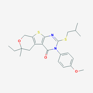 6-ethyl-2-(isobutylsulfanyl)-3-(4-methoxyphenyl)-6-methyl-3,5,6,8-tetrahydro-4H-pyrano[4’,3’:4,5]thieno[2,3-d]pyrimidin-4-one is a complex organic compound that belongs to the class of pyrano[4’,3’:4,5]thieno[2,3-d]pyrimidin-4-one derivatives This compound is characterized by its unique structure, which includes a pyrano ring fused with a thieno ring and a pyrimidinone core