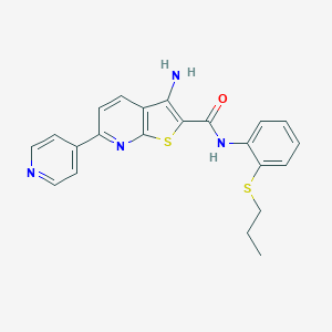 The mechanism of action of 3-amino-N-[2-(propylsulfanyl)phenyl]-6-(4-pyridinyl)thieno[2,3-b]pyridine-2-carboxamide involves its interaction with specific molecular targets. The compound likely binds to bacterial enzymes or cell membranes, disrupting their function and leading to the inhibition of microbial growth . The exact molecular pathways and targets are still under investigation, but its antimicrobial properties are well-documented .