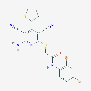 2-{[6-amino-3,5-dicyano-4-(2-thienyl)-2-pyridinyl]sulfanyl}-N-(2,4-dibromophenyl)acetamide is a useful research compound. Its molecular formula is C19H11Br2N5OS2 and its molecular weight is 549.3g/mol. The purity is usually 95%.