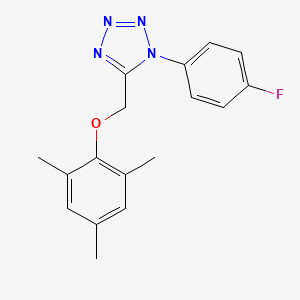 1-(4-fluorophenyl)-5-[(2,4,6-trimethylphenoxy)methyl]-1H-tetrazole is a synthetic compound notable for its unique structural features, including a tetrazole ring and specific aromatic substituents. This compound has garnered attention in medicinal chemistry and biological studies due to its potential pharmacological applications.