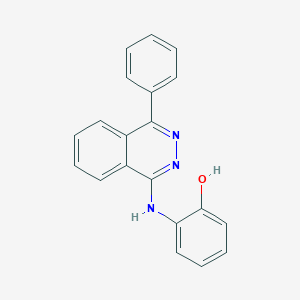 2-[(4-Phenylphthalazin-1-yl)amino]phenol is a heterocyclic compound featuring a phthalazine core substituted with a phenyl group at the 4-position and an aminophenol moiety at the 1-position. The phthalazine scaffold is known for its versatility in medicinal chemistry, particularly in targeting enzymes and receptors due to its planar aromatic structure and ability to participate in hydrogen bonding via the amino and phenolic hydroxyl groups. This compound’s molecular formula is C₁₉H₁₄N₃O, with a molecular weight of 300.34 g/mol.