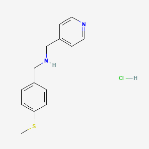 1-(4-methylsulfanylphenyl)-N-(pyridin-4-ylmethyl)methanamine;hydrochloride is a chemical compound that has garnered interest in various fields of scientific research. This compound is characterized by the presence of a methylsulfanyl group attached to a phenyl ring, which is further connected to a pyridin-4-ylmethyl group through a methanamine linkage. The hydrochloride salt form enhances its solubility in aqueous solutions, making it suitable for various applications.